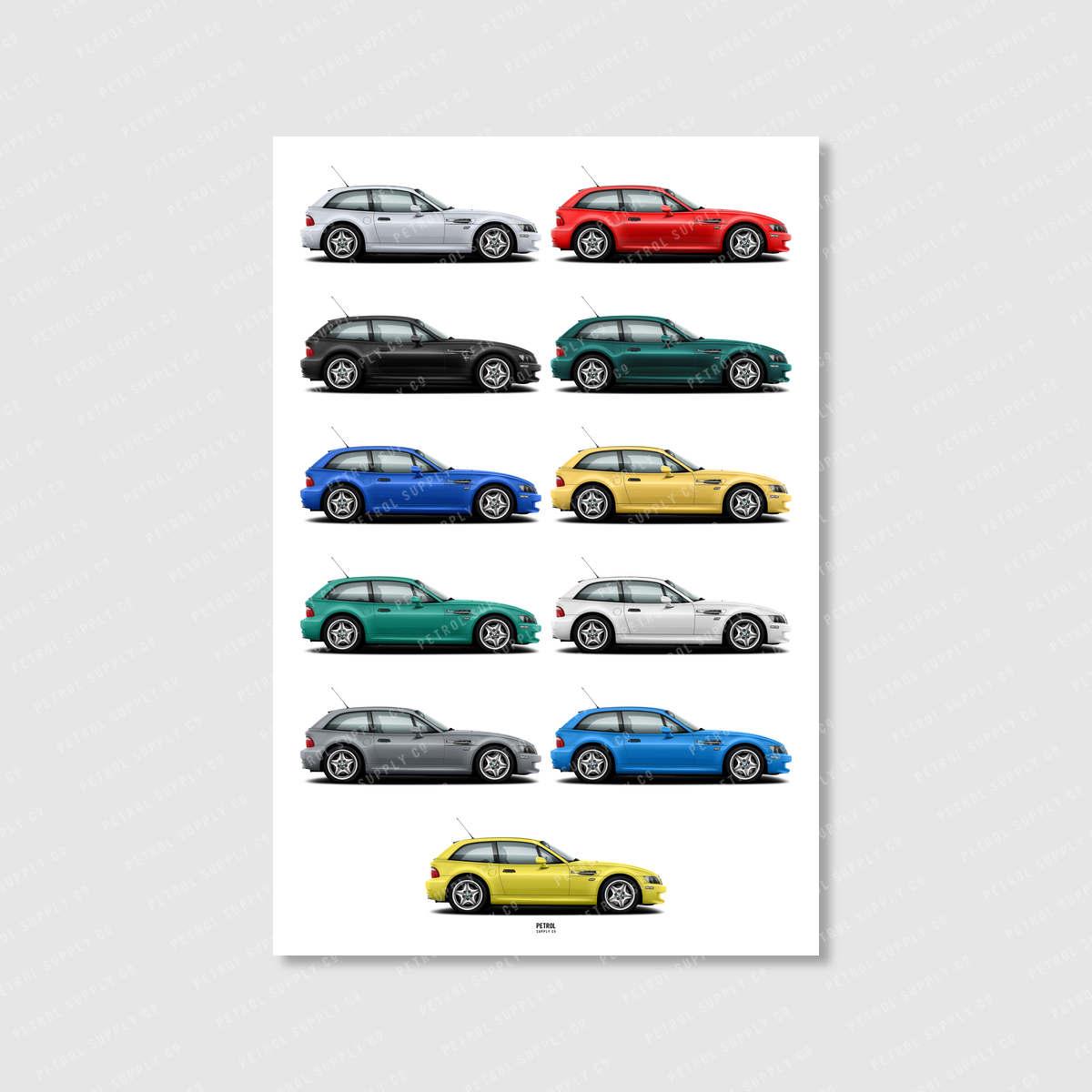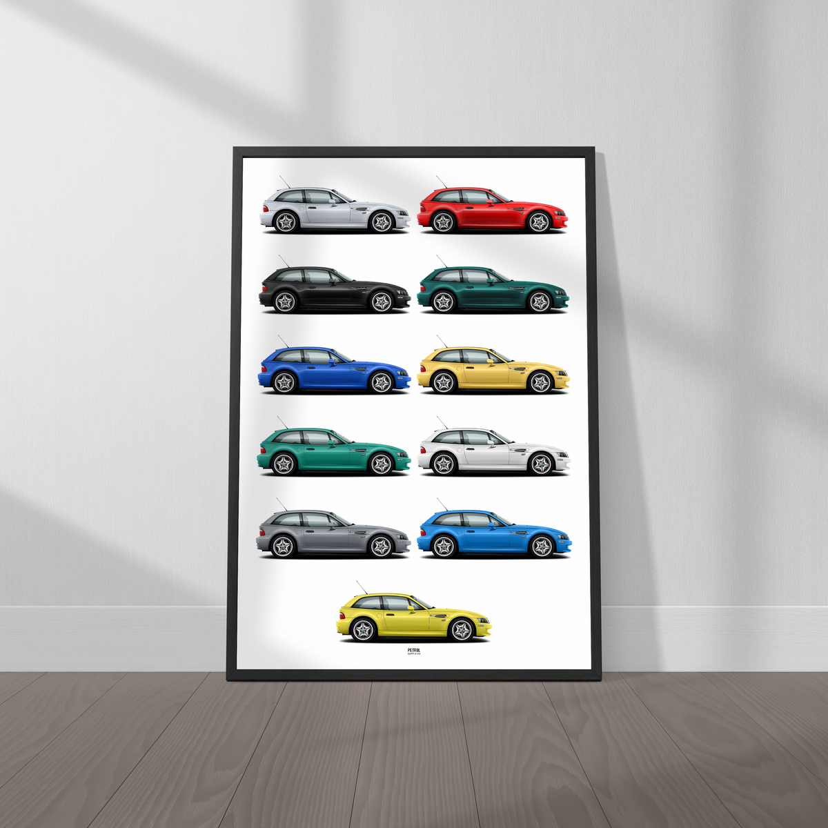 BMW M Coupe Colors poster featuring various color options available for the M Coupe (E36/8)