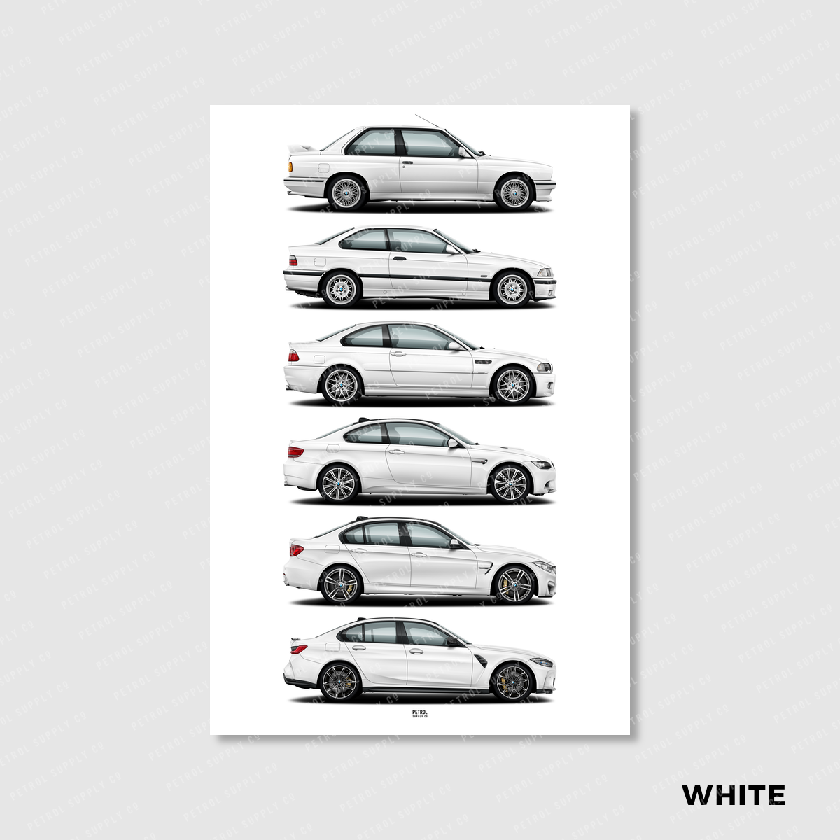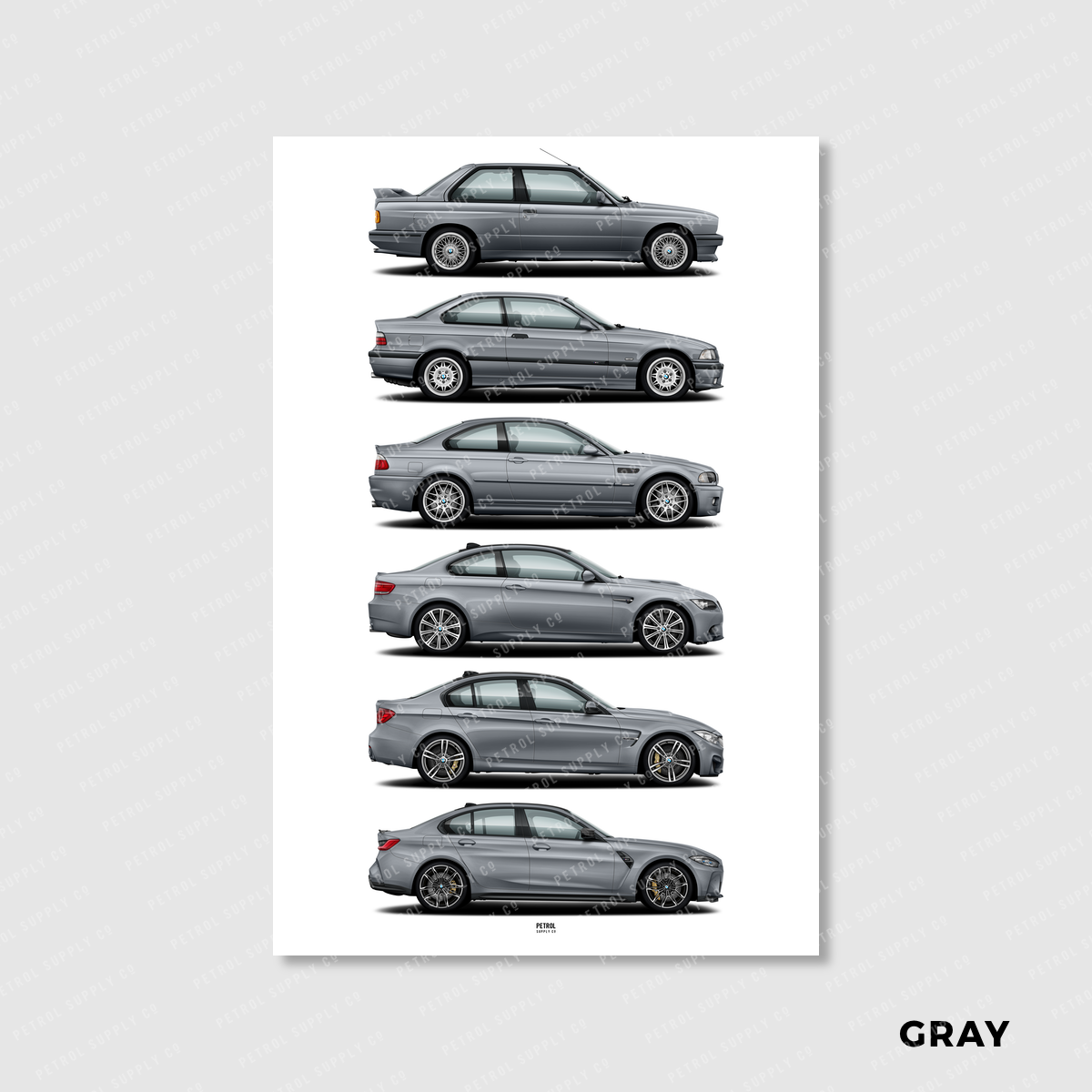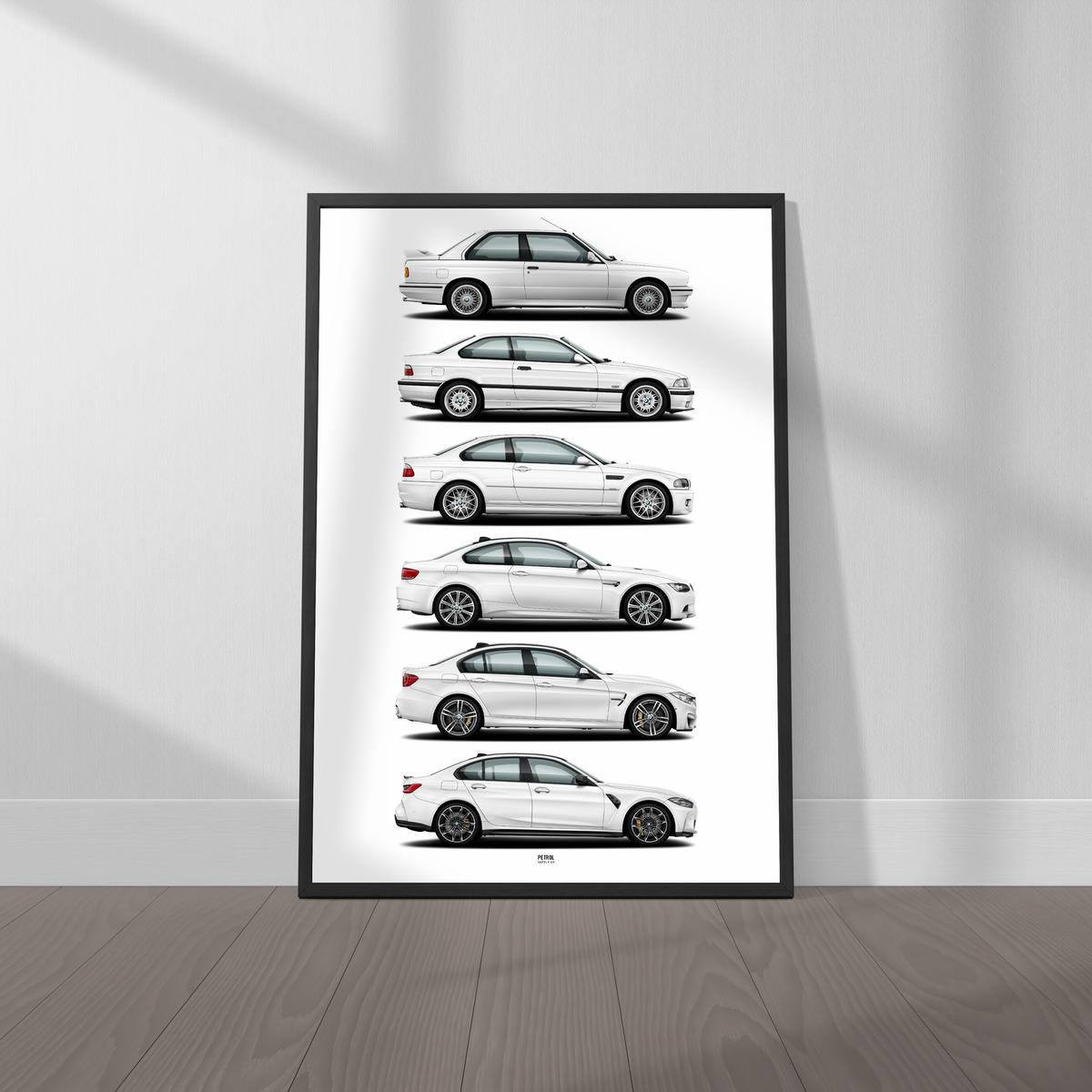 BMW M3 Evolution poster featuring the E30, E36, E46, E92, F80, and G80 generations.