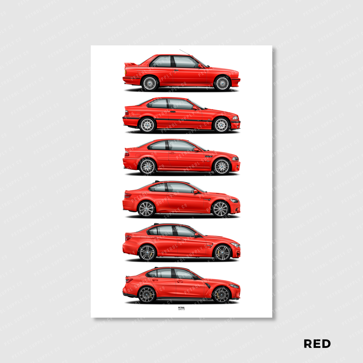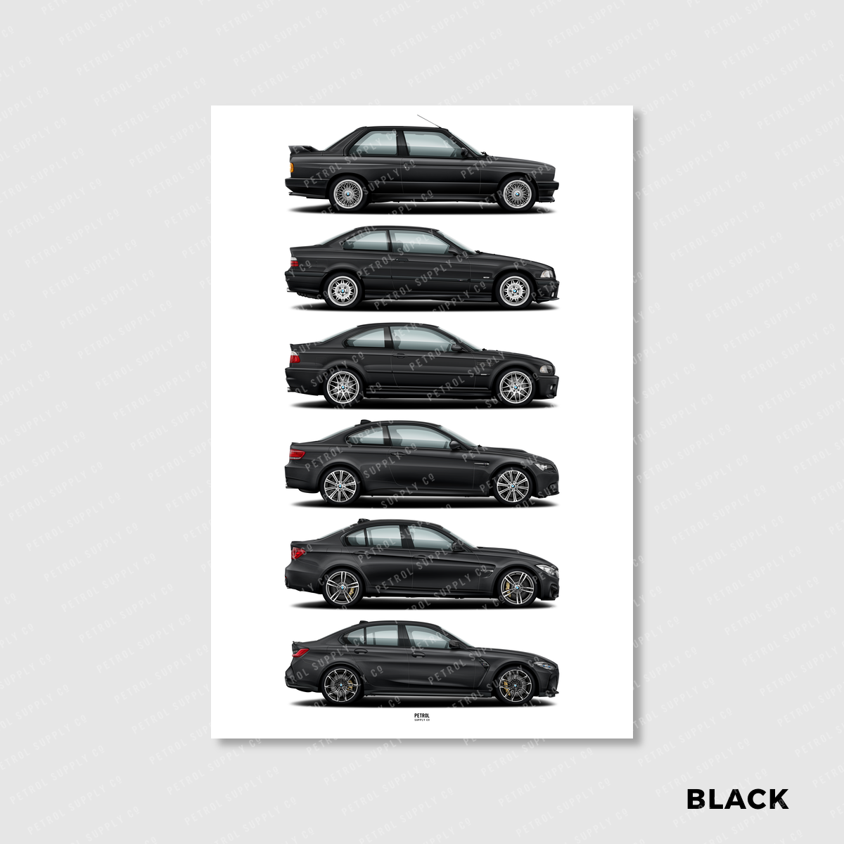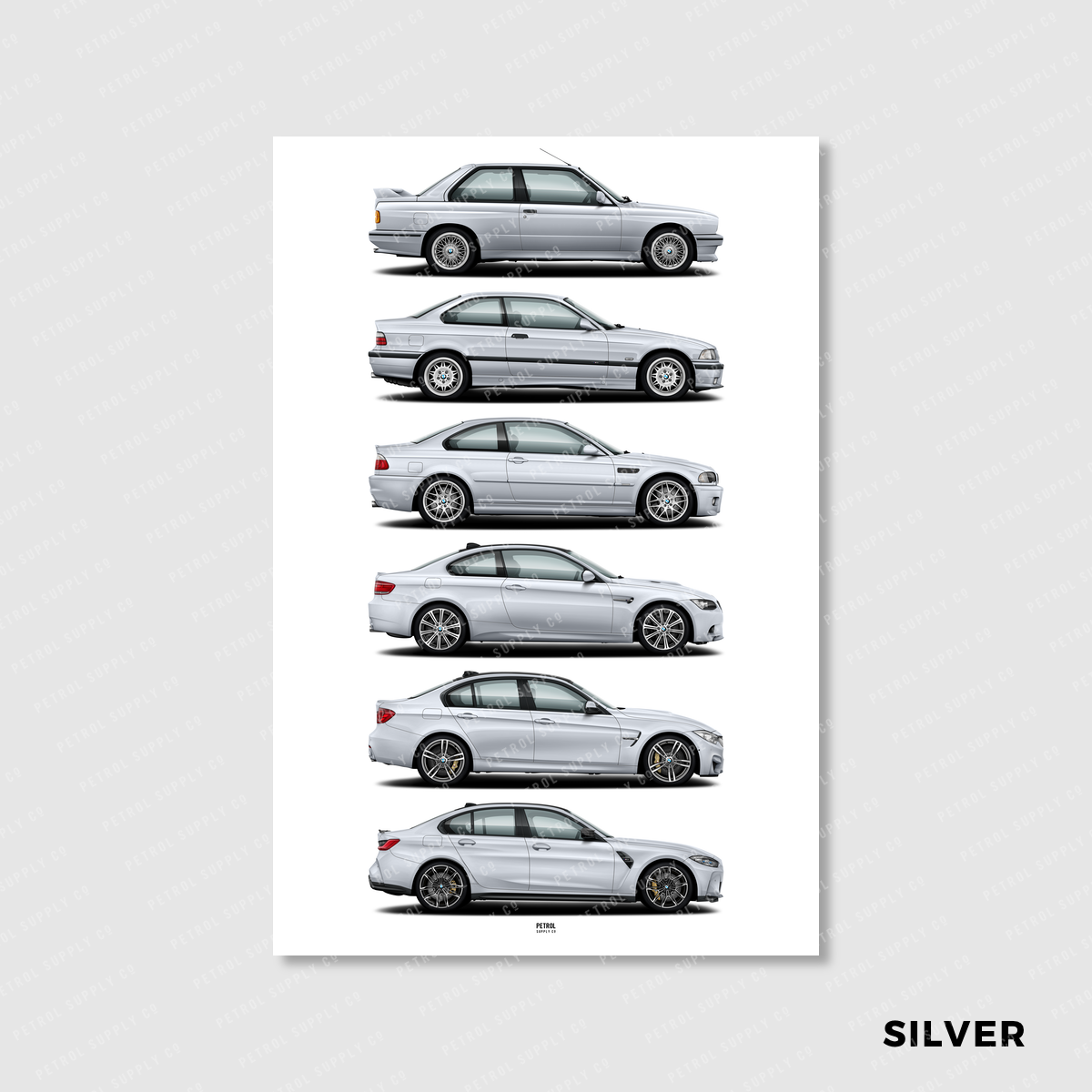 BMW M3 Evolution poster featuring the E30, E36, E46, E92, F80, and G80 generations.
