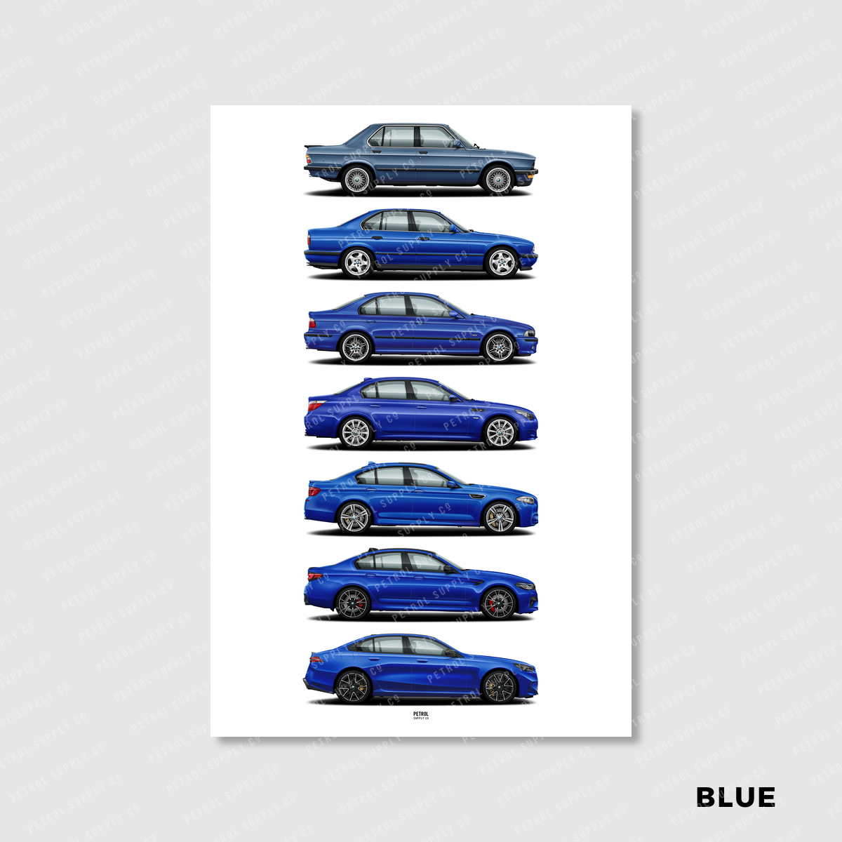 BMW M5 Evolution poster featuring the E28, E34, E39, E60, F10, F90, and G90 generations.
