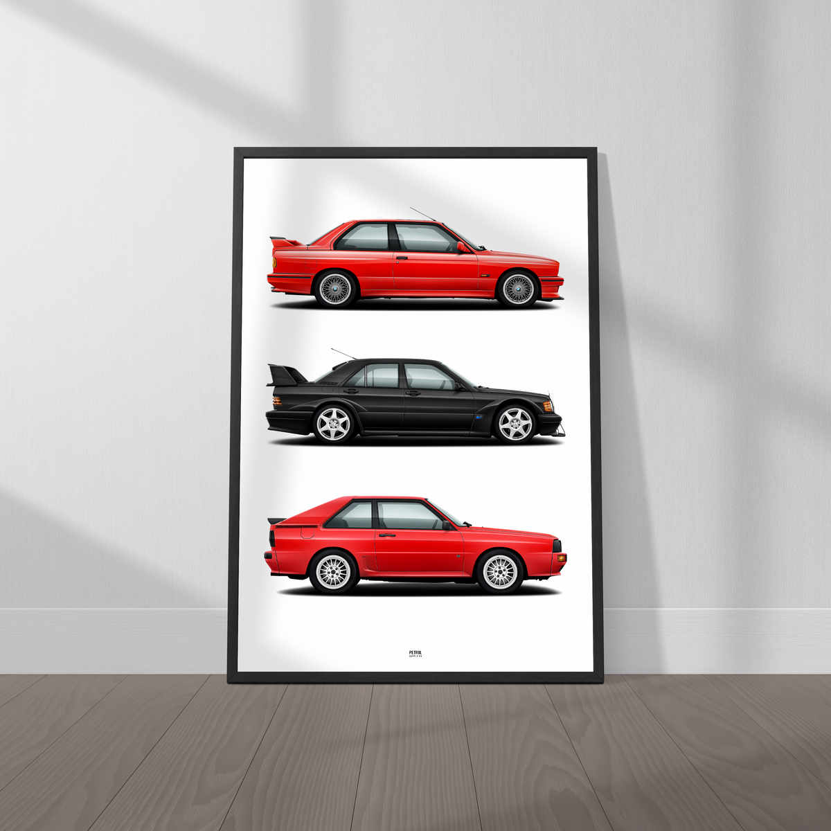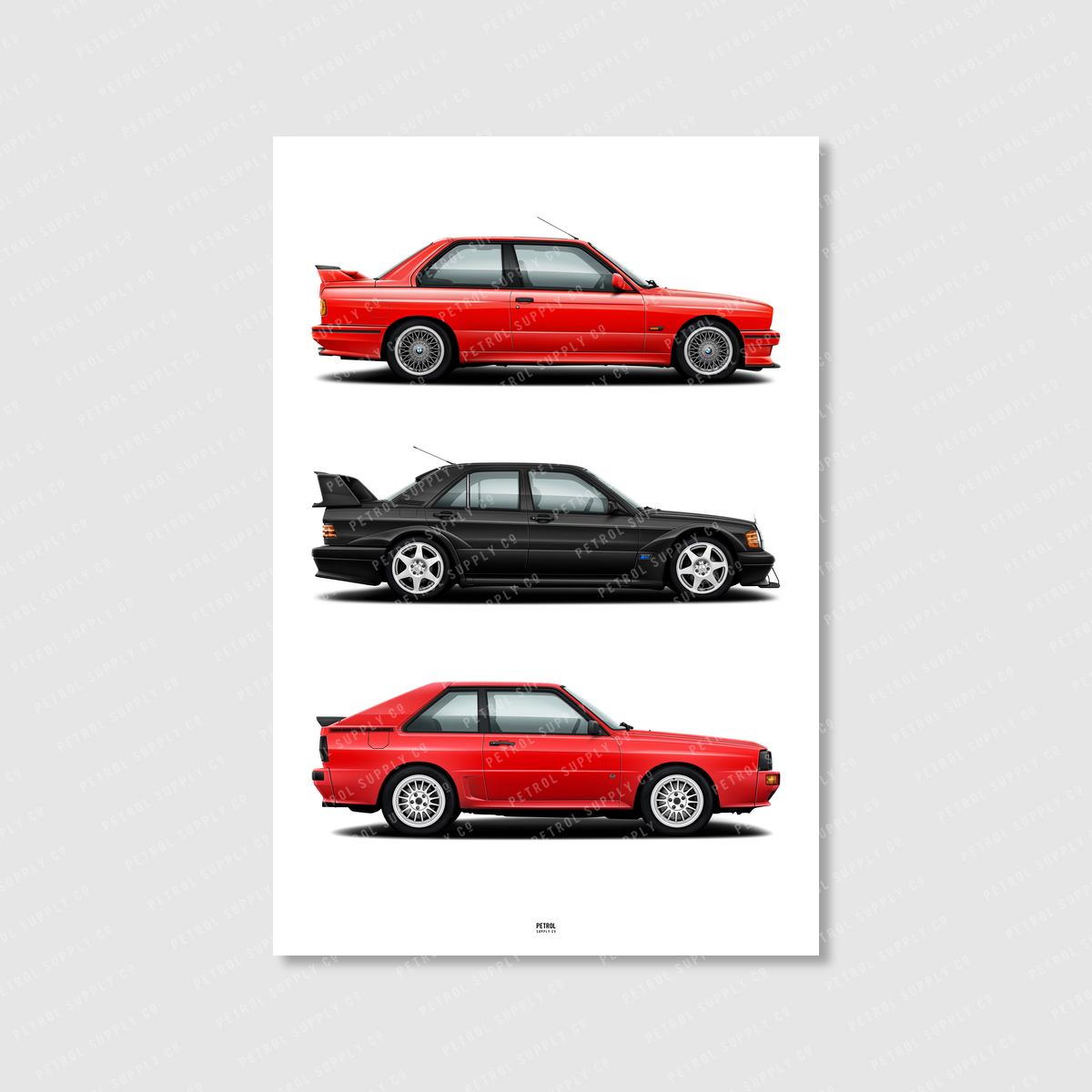 Homologation Specials automotive art print featuring the BMW E30 M3 Sport Evolution, Mercedes-Benz 190 E Evolution II, and Audi Sport Quattro.