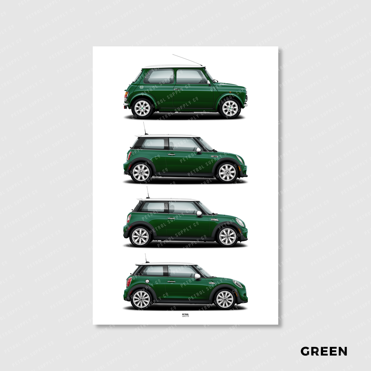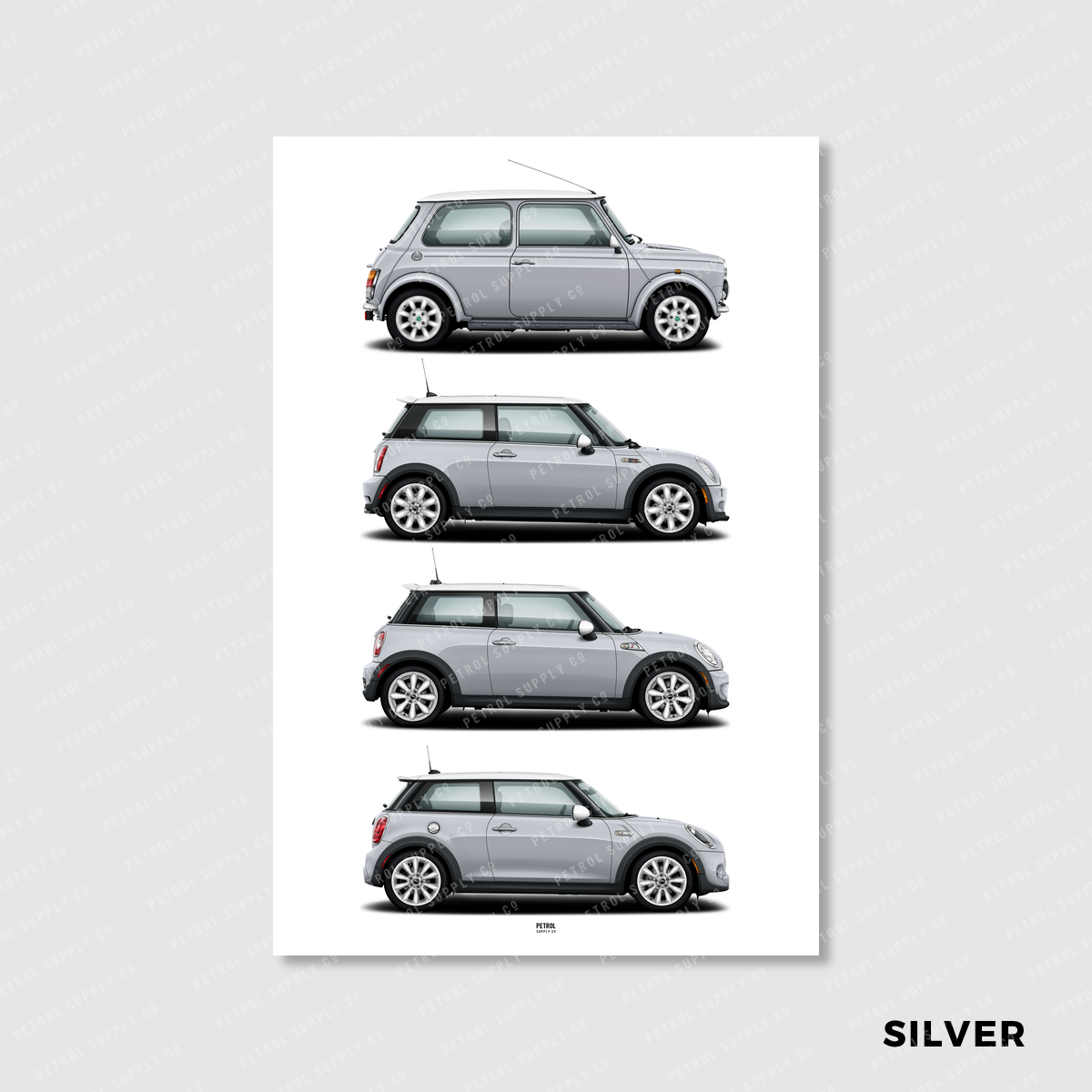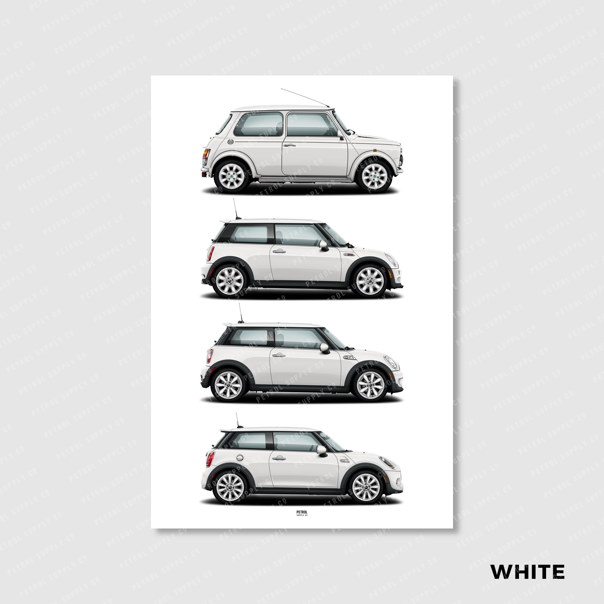 MINI Cooper Evolution poster featuring the classic Rover Mini Mk7, R50/R53, R56, and F56 generations.
