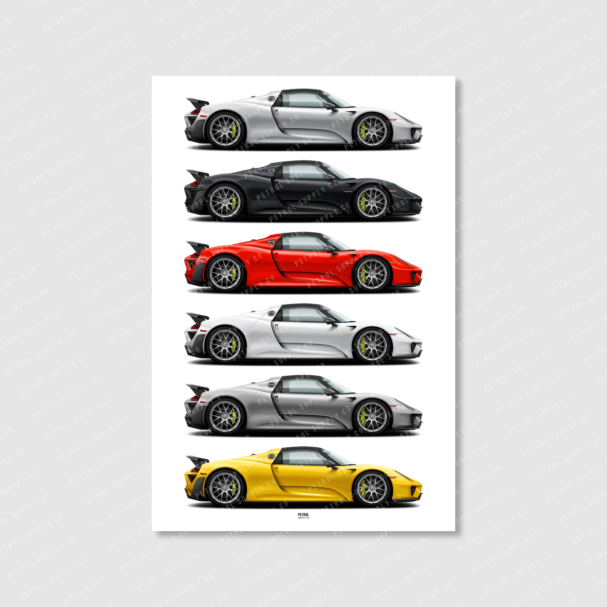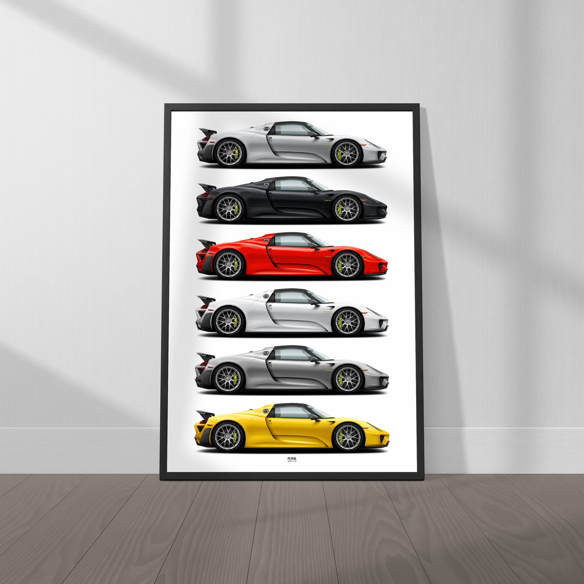Porsche 918 Spyder poster featuring various color options available for the 918 Spyder