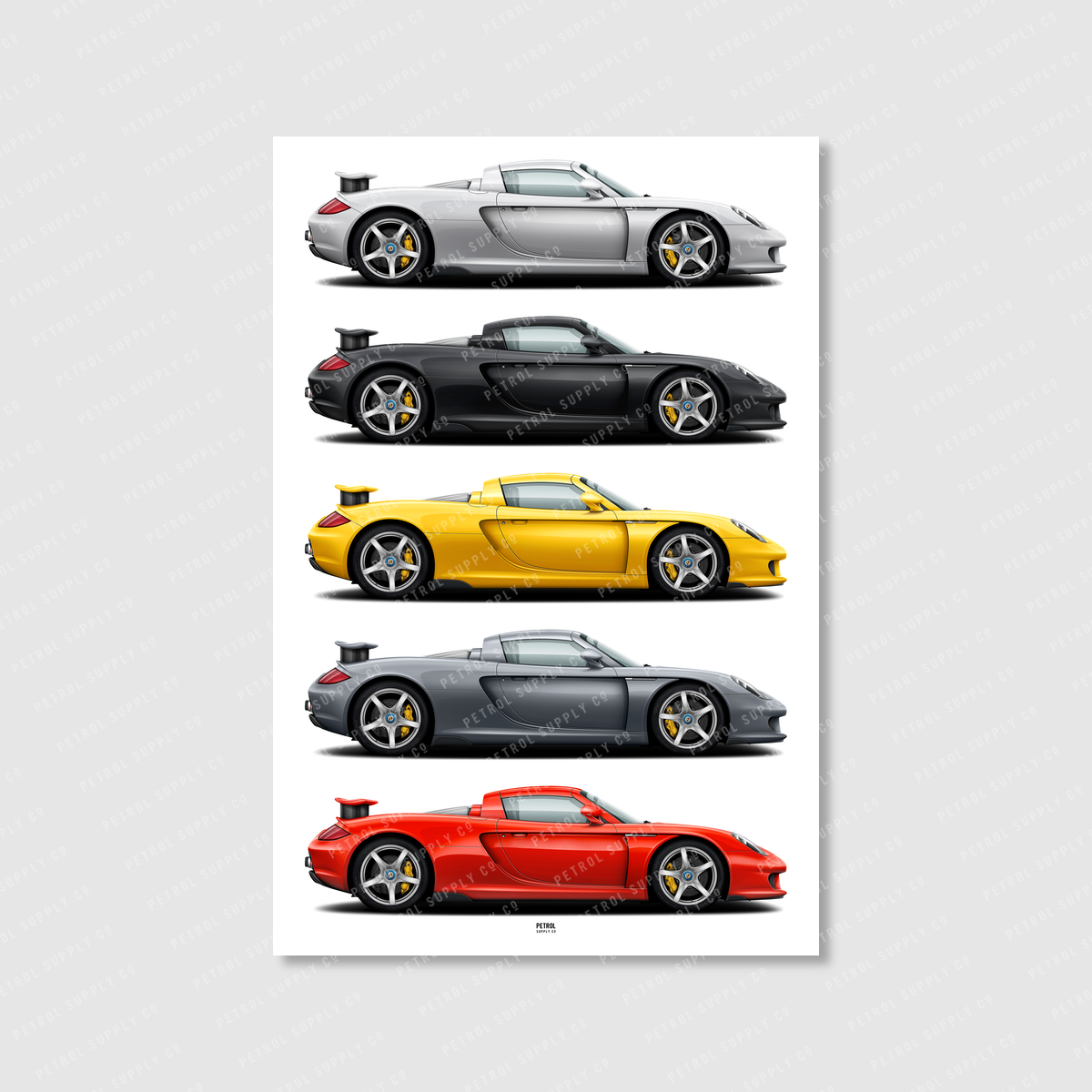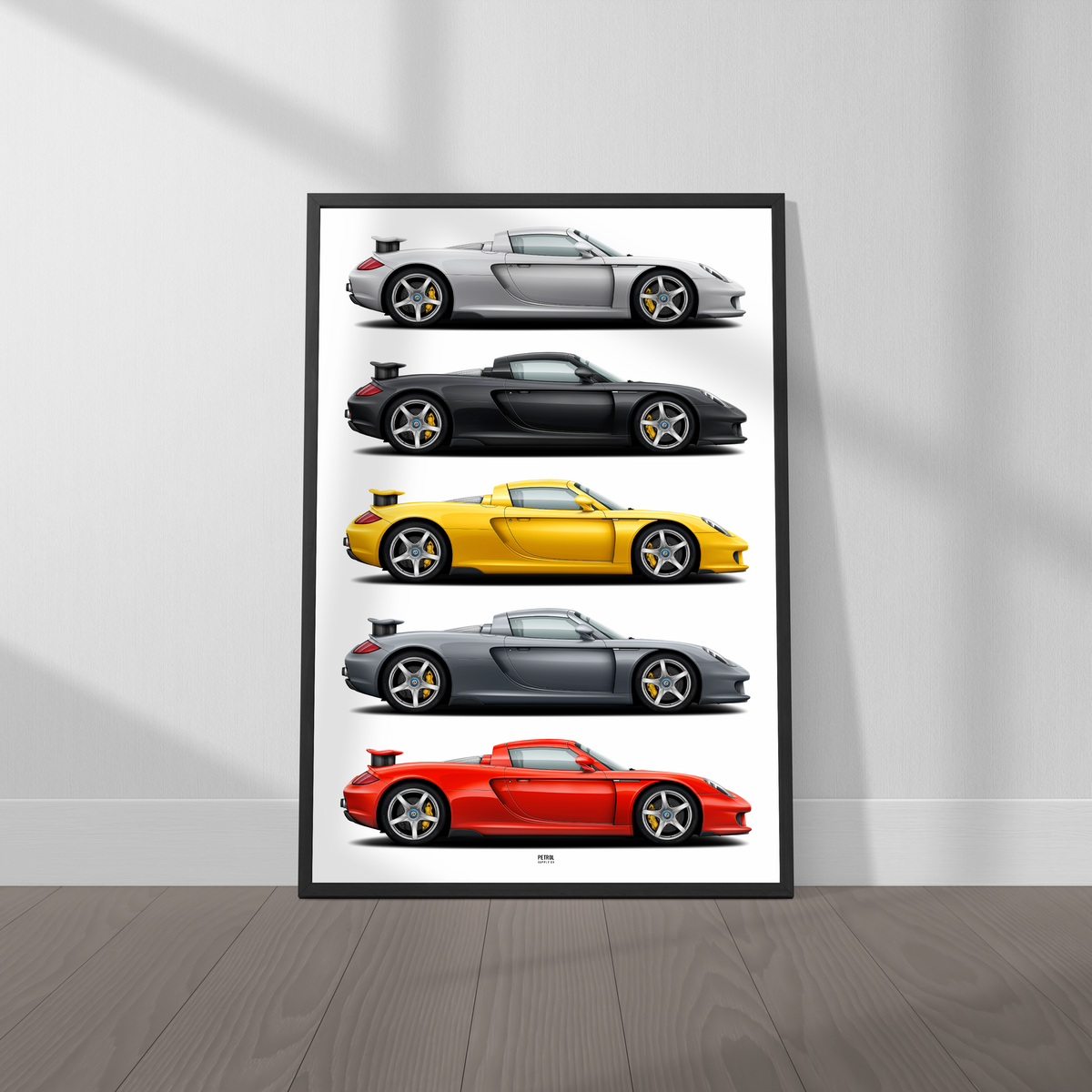 Porsche Carrera GT poster featuring various color options available for the Carrera GT (980)